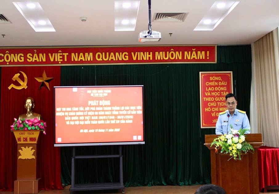 Đồng chí Đại tá Dương Trung Tiến, Chính trị viên Hệ, Tổ trưởng tổ thi đua phát động đợt thi đuatăng tốc, bứt phá hoàn thành thắng lợi các mục tiêu, nhiệm vụ chào mừng kỷ niệm 80 năm ngày tổng tuyển cử đầu tiên Quốc hội Việt Nam (06/01/1946 – 06/01/2026) và Đại hội lần thứ XIV của Đảng, trong đó đã bám sát các nội dung chỉ tiêu thi đua của cấp trên, xác định các nội dung, chỉ tiêu thi đua cụ thể theo từng giai đoạn, với những biện pháp thực hiện có tính khả thi cao, gắn sát với đặc điểm tình hình, nhiệm vụ của Hệ.Trong đó nhấn mạnh:Hoạt động thi đua đẩy mạnh công tác tuyên truyền, giáo dục cho cán bộ, chiến sỹ, nhân viên trong toàn Hệ về ý nghĩa, tầm quan trọng của Đại hội lần thứ XIV của Đảng; bối cảnh, ý nghĩa, giá trị lịch sử to lớn của cuộc Tổng tuyển cử bầu Quốc hội khóa đầu tiên của đất nước; tinh thần yêu nước, yêu truyền thống cách mạng vẻ vang của Quân đội và dân tộc ta; những thành tích xuất sắc, tiêu biểu của Học viện, qua đó triển khai đợt thi đua với tinh thần “Quyết tâm cao, hành động quyết liệt, hiệu quả thiết thực”, góp phần thực hiện thắng lợi nhiệm vụ phát triển kinh tế - xã hội, bảo đảm quốc phòng, an ninh, đưa đất nước phát triển bứt phá, giàu mạnh trong kỷ nguyên mới.
