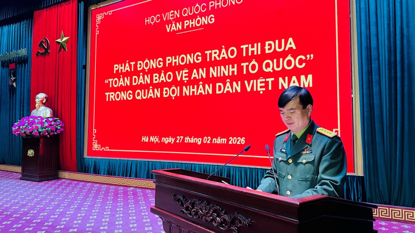 Thực hiện Hướng dẫn số 391/HD-CT ngày 30/01/2026 của Cục Chính trị về tổ chức phong trào thi đua “Toàn dân bảo vệ an ninh Tổ quốc” trong Quân đội nhân dân Việt Nam. Ngày 27/02/2026, Đảng ủy, chỉ huy Văn phòng long trọng tổ chức phát động phong trào thi đua “Toàn dân bảo vệ an ninh Tổ quốc” trong Quân đội nhân dân Việt Nam. Tời dự và chỉ đạo lễ phát động thi đua có đồng chí Đại tá Ngô Văn Sáng, Chánh Văn phòng cùng toàn thể cán bộ, sĩ quan, quân nhân chuyên nghiệp, hạ sĩ quan – binh sĩ thuộc cơ quan Văn phòng.
