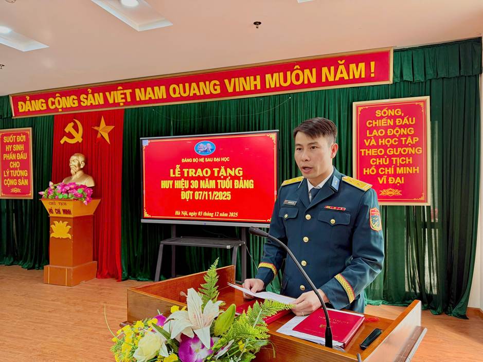 Tham gia buổi lễ có đồng chí Đại tá Dương Trung Tiến, Bí thư Đảng ủy, Chính trị viên Hệ; Đồng chí Vũ Xuân Trường, Phó bí thư Đảng ủy, Hệ trưởng; các đồng chí trong Đảng ủy và toàn thể đảng viên trong Đảng bộ Hệ Sau đại học.