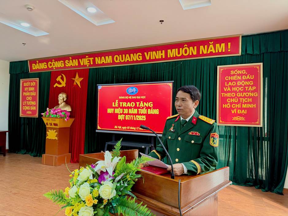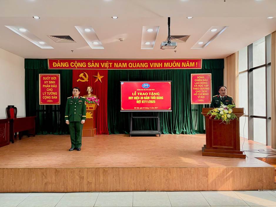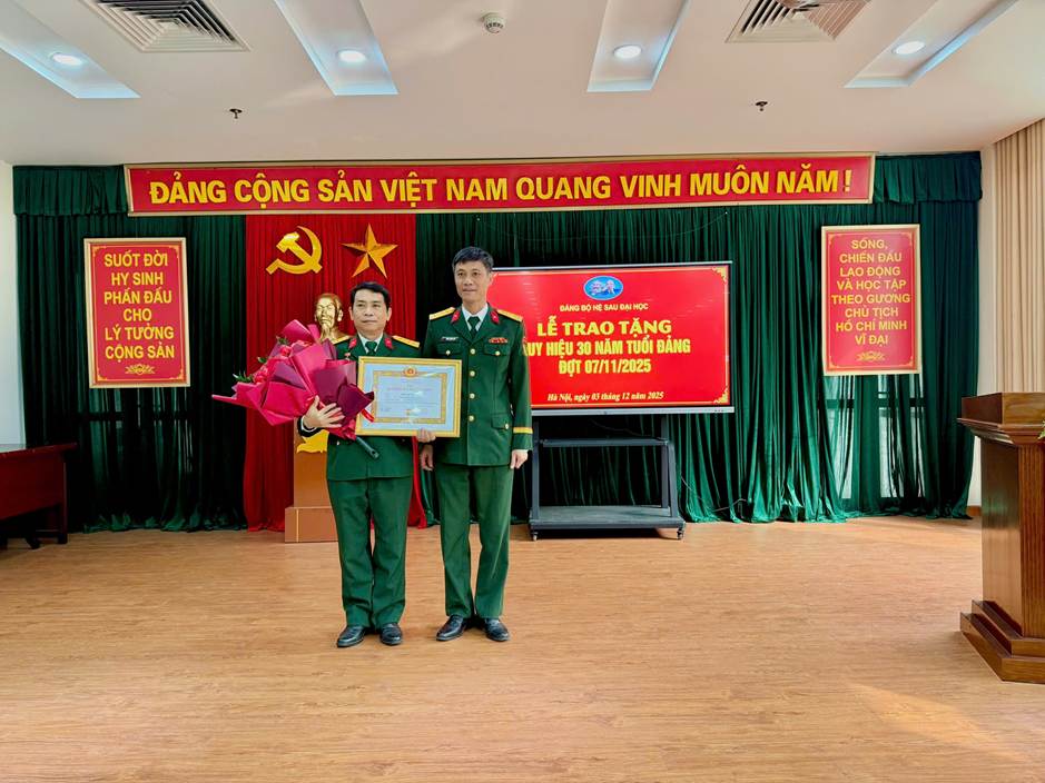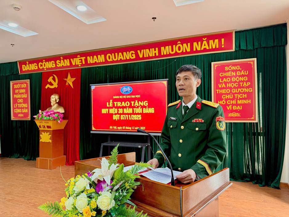 Chiều ngày 03/12, tại Học viện Quốc phòng, Đảng bộ Hệ Sau đại học tổ chức Lễ trao tặng Huy hiệu 30 năm tuổi Đảng cho đồng chí Đại tá Chu Đức Mão, đảng viên đang sinh hoạt tại Chi bộ Lớp nghiên cứu sinh khóa 32.