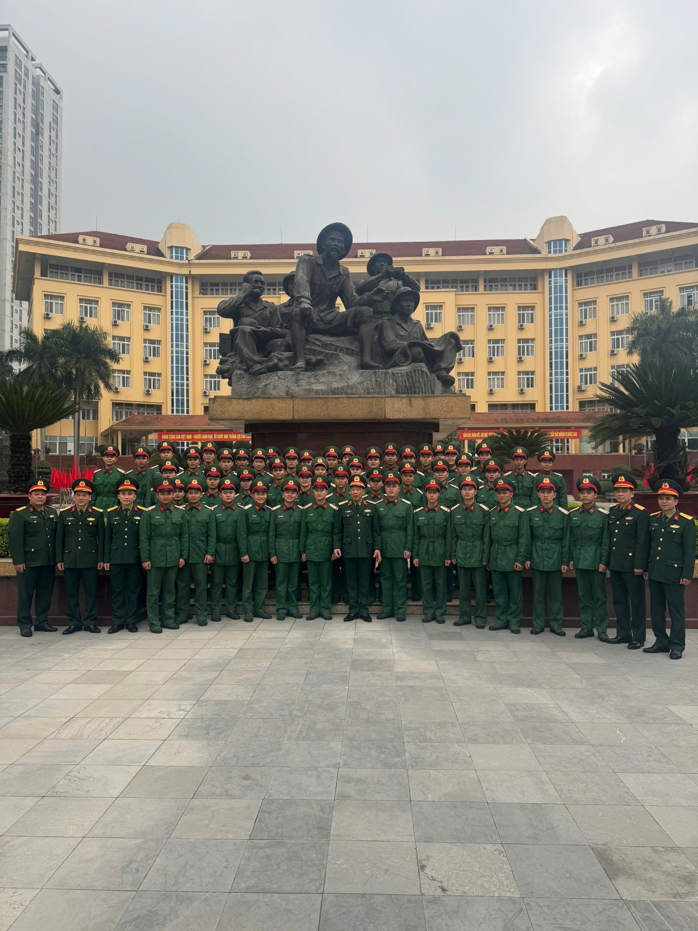 Các chiến sĩ chụp ảnh lưu niệm với các đồng chí lãnh đạo Học viện Quốc phòng