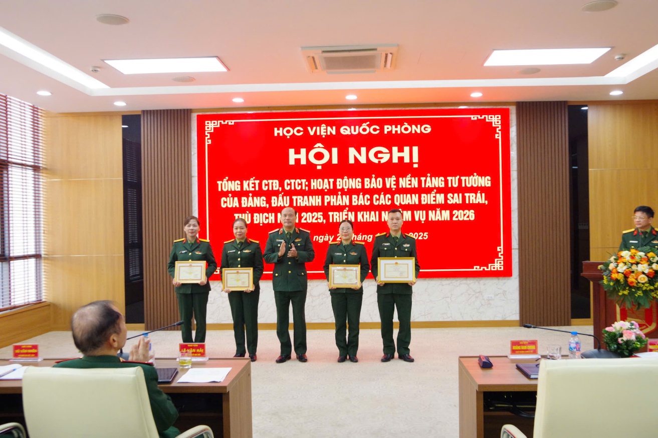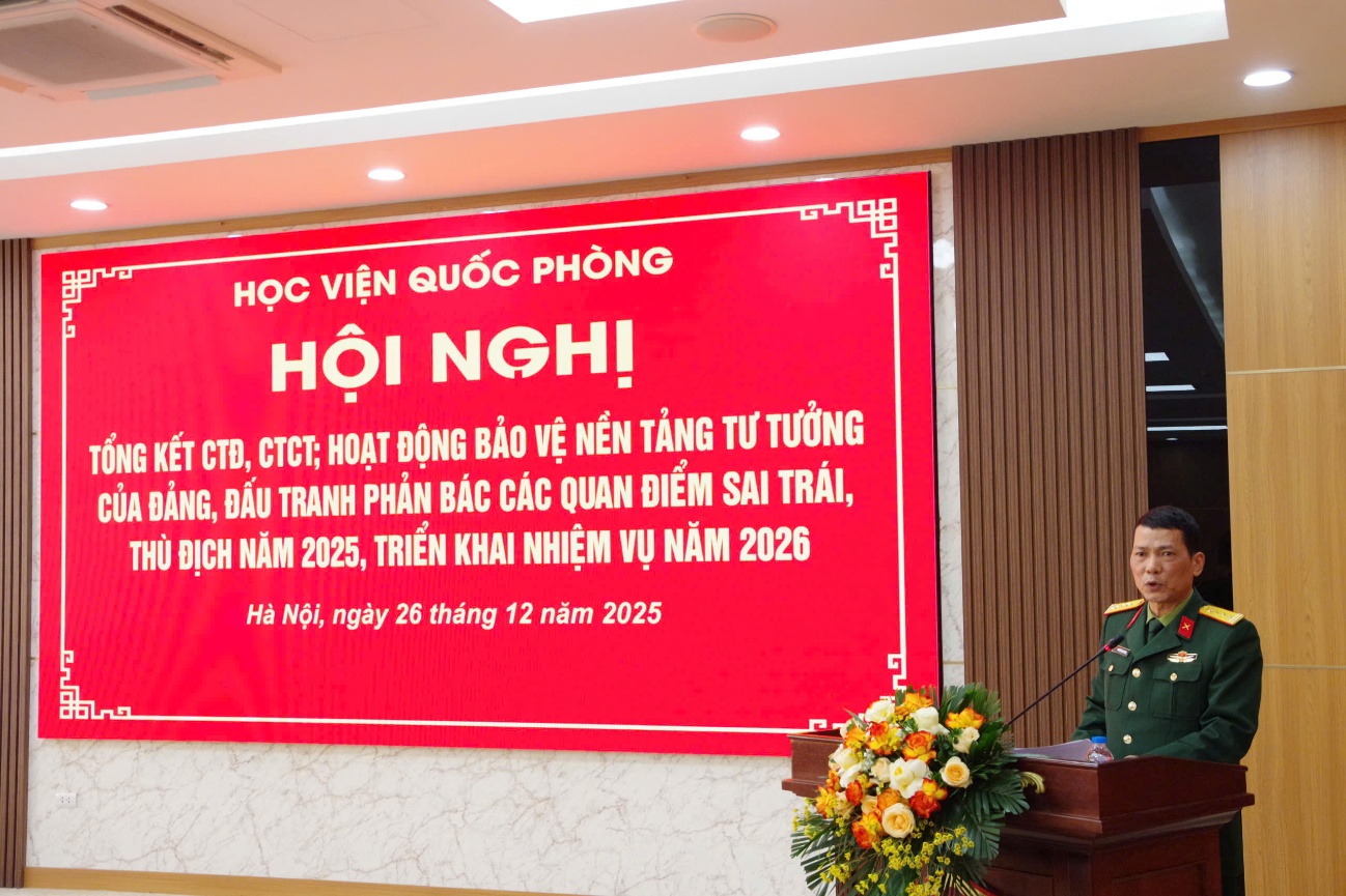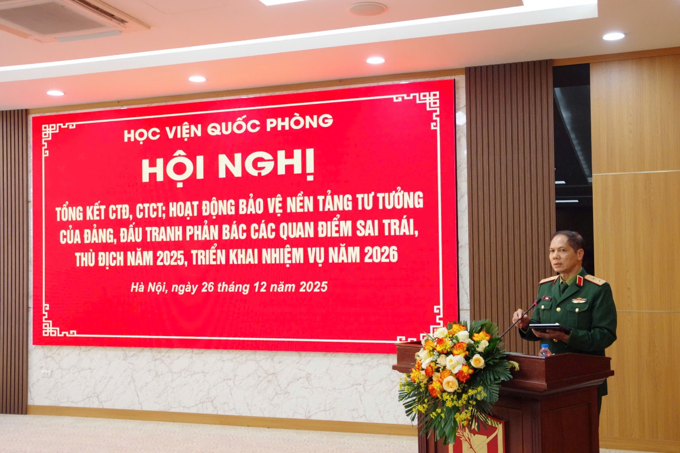 Ngày 26/12/2025, Học viện Quốc phòng tổ chức Hội nghị Tổng kết công tác đảng, công tác chính trị; hoạt động bảo vệ nền tảng tư tưởng của Đảng, đấu tranh phản bác các quan điểm sai trái, thù địch năm 2025; triển khai nhiệm vụ năm 2026.
