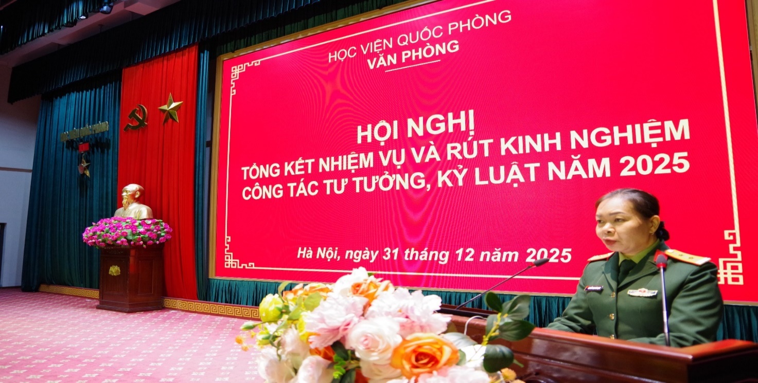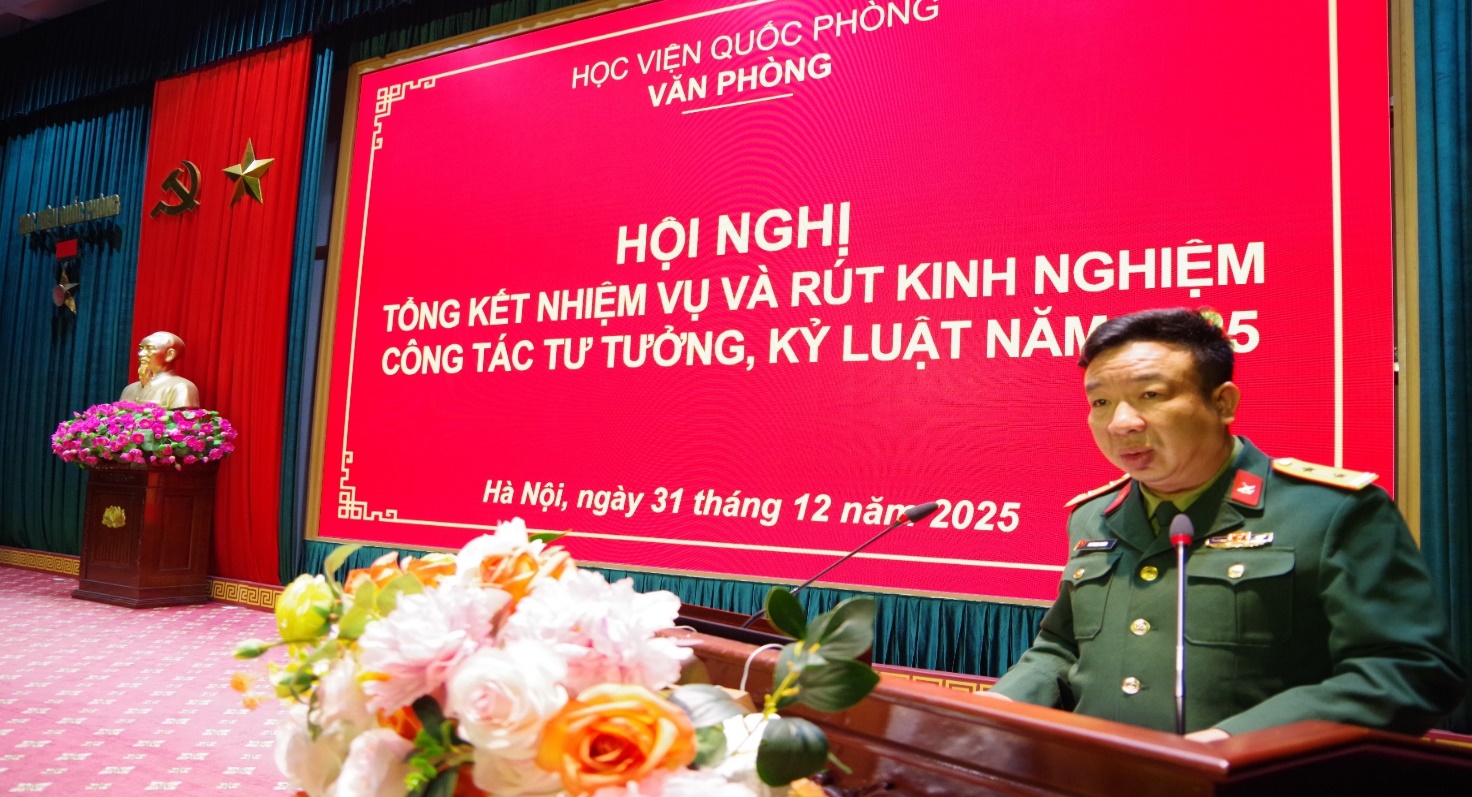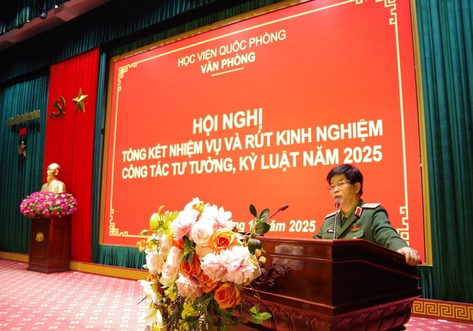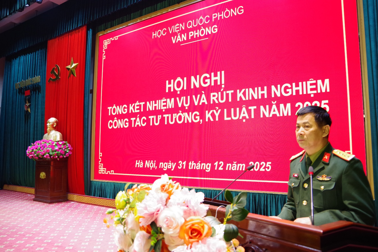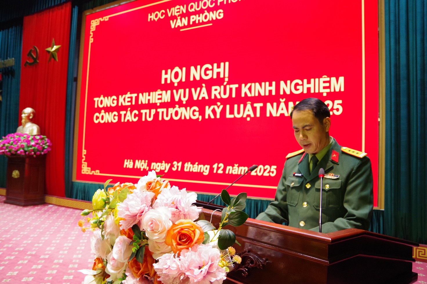 Tại hội nghị đồng chí Nguyễn Tiến Thi, Phó Chánh Văn phòng đã báo cáo tổng kết nhiệm vụ và rút kinh nghiệm công tác tư tưởng, kỷ luật năm 2025. Trong năm 2025, được sự lãnh đạo, chỉ đạo của Đảng ủy, Ban Giám đốc Học viện, sự quản lý điều hành quyết liệt của Đảng ủy, Chỉ huy Văn phòng và Cấp ủy, Chỉ huy các