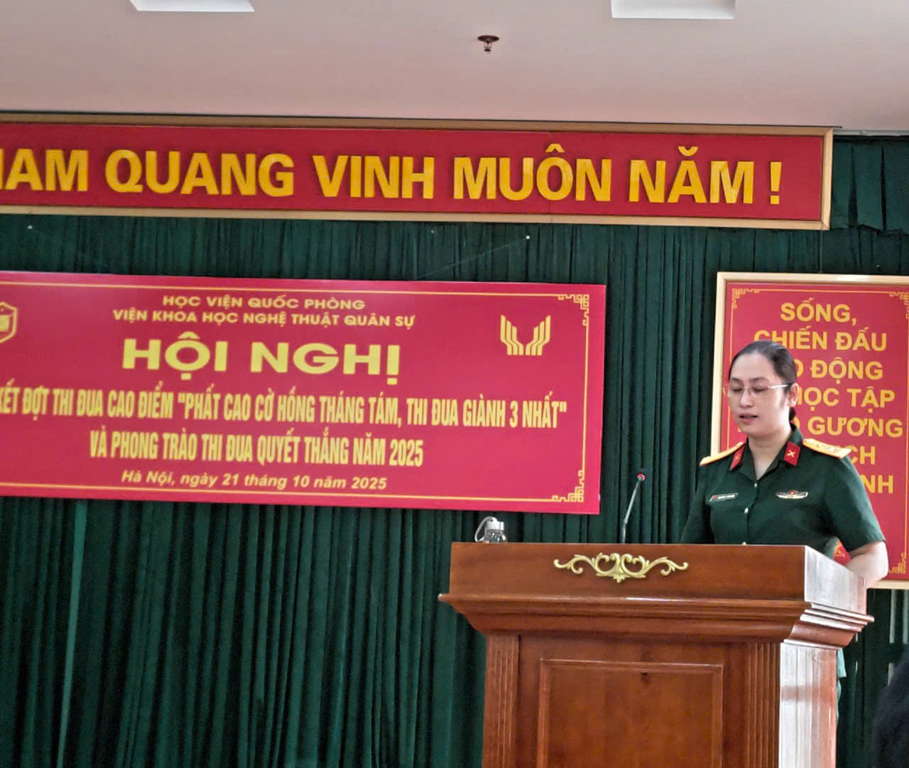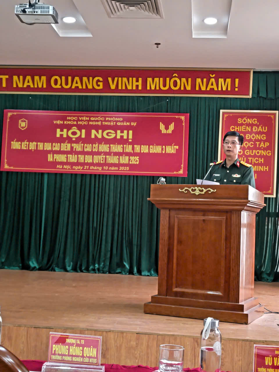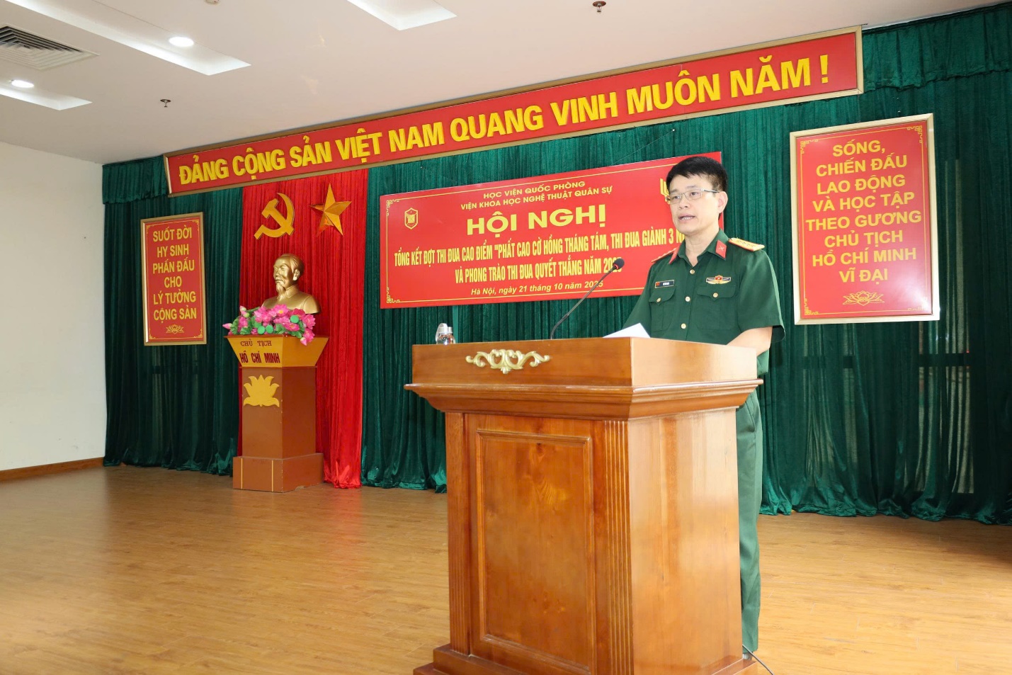 Ngày 21 tháng 10 năm 2025, Viện Khoa học Nghệ thuật quân sự đã tổ chức Hội nghị tổng kết đợt thi đua cao điểm “Phất cao cờ hồng tháng Tám - Thi đua giành 3 nhất” và phong trào Thi đua Quyết thắng năm 2025. Đồng chí Đại tá, Tiến sĩ Vũ Ngọc Thủy, Ủy viên Đảng ủy Học viện, Phó Bí thư Đảng ủy, Viện trưởng chủ trì Hội nghị. Dự Hội nghị có các đồng chí trong Đảng ủy, Chỉ huy Viện; chỉ huy các Phòng, Tạp chí Nghệ thuật Quân sự Việt Nam và cán bộ, nhân viên trong toàn Viện.