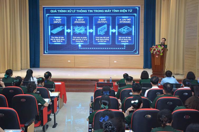 Trong thời gian 1 tuần, các học viên được bồi dưỡng kỹ năng sử dụng công nghệ thông tin cơ bản; sử dụng bộ công cụ văn phòng, các quy định trong soạn thảo văn bản để hoàn chỉnh một văn bản, bảng tính; cách tạo kết nội sử dụng mạng dữ liệu quân sự, sử dụng mạng an toàn, bảo mật và một số kiến thức về văn thư, lưu trữ điện tử; kỹ năng gửi, nhận và xử lý văn bản điện tử có chữ ký số; hướng dẫn khai thác các ứng dụng trí tuệ nhân tạo trong xử lý và ban hành văn bản. Đặc biệt trong đợt này các đồng chí sẽ được cán bộ của Văn phòng giới thiệu, hướng dẫn về việc gửi, nhận và xử lý văn bản điện tử có độ mật đến “Tối mật”.