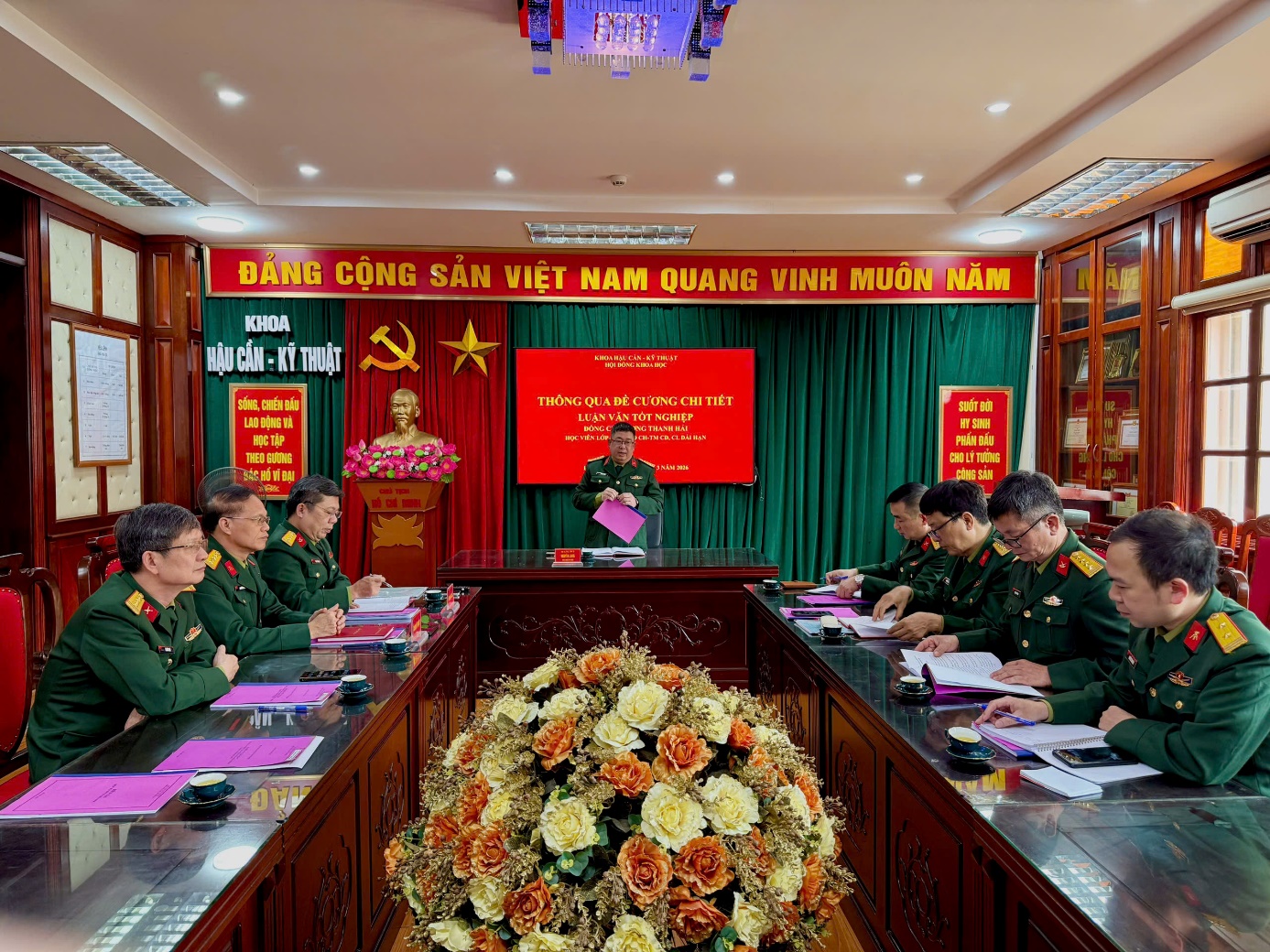 Thực hiện kế hoạch công tác tháng 3/2026 của Khoa, chiều ngày 02 tháng 3 năm 2026, Hội đồng Khoa học Khoa Hậu cần - Kỹ thuật đã tiến hành họp thông qua đề cương chi tiết cho đồng chí học viên lớp Đào tạo CH-TM chiến dịch, chiến lược dài hạn, Khóa 13. Đồng chí Đại tá, Phó Giáo sư, Tiến sĩ Nguyễn Long, Chủ nhiệm khoa, Chủ tịch Hội đồng chủ trì Hội nghị. Tham dự có đầy đủ các thành viên trong Hội đồng khoa học của khoa.