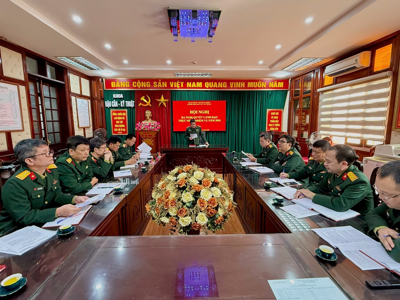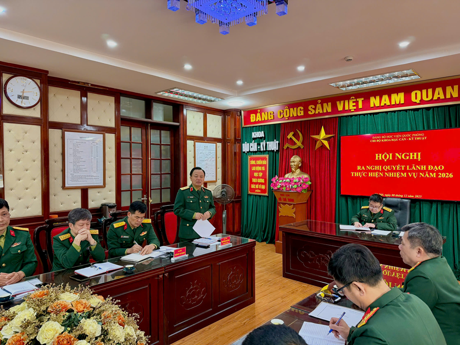 Thực hiện kế hoạch công tác tháng 12/2025 của Khoa, chiều ngày 08 tháng 12 năm 2025, Chi bộ Khoa Hậu cần - Kỹ thuật tổ chức Hội nghị ra nghị quyết lãnh đạo thực hiện nhiệm vụ năm 2026. Dự và chỉ đạo Hội nghị có đồng chí Trung tướng Nguyễn Anh Tuấn, Phó Giám đốc Học viện.. Đồng chí Đại tá Nguyễn Long, Phó Bí thư chi bộ, Chủ nhiệm khoa, Chủ trì Hội nghị. Tham dự có đầy đủ các đồng chí đảng viên trong chi bộ và đại diện cơ quan chức năng.