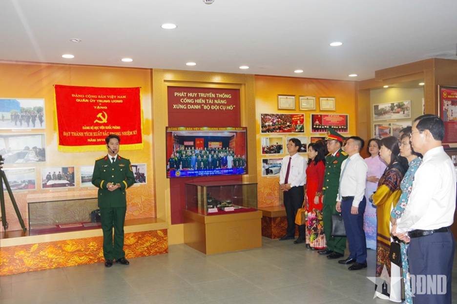 Các học viên tham quan nhà truyền thống Học viện Quốc phòng.